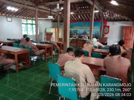 Dalam koordinasi senin ini di buka oleh Jogoboyo kalurahan ( Agus Budianto ) setelah dilakukan pembukaan oleh Jogoboyo dan juga mengucapkan selama berpuasa kepada pamong se Kalurahan Karangmojo, beliau juga menegaskan terkait SPPT dan buku rekapan yang sudah di bagikan ke dukuh yang bertujuan agar segera bisa memilah sesuai data sppt dan dibagikan ke wajib pajak. Dalam koordinasi saat ini lurah karangmojo Agus Budiyono juga menyampaikan terkait program setifikat PTSL agar segera di jalankan karena dari pihak BPN sudah meminta terkait progres pemberkasannya. Pada kesempatan ini beliau juga meminta pamong bisa ikut safari ramadhan dari kabupaten Gunungkidul yang saat ini di tuju masjid Ihya Ul Ulum Padukuhan Bulu yang akan dilaksanakan besok hari Kamis tanggal 5 Maret 2026. Dimohon para Pamong bisa menjadi among tamu dalam kegiatan safari nanti.